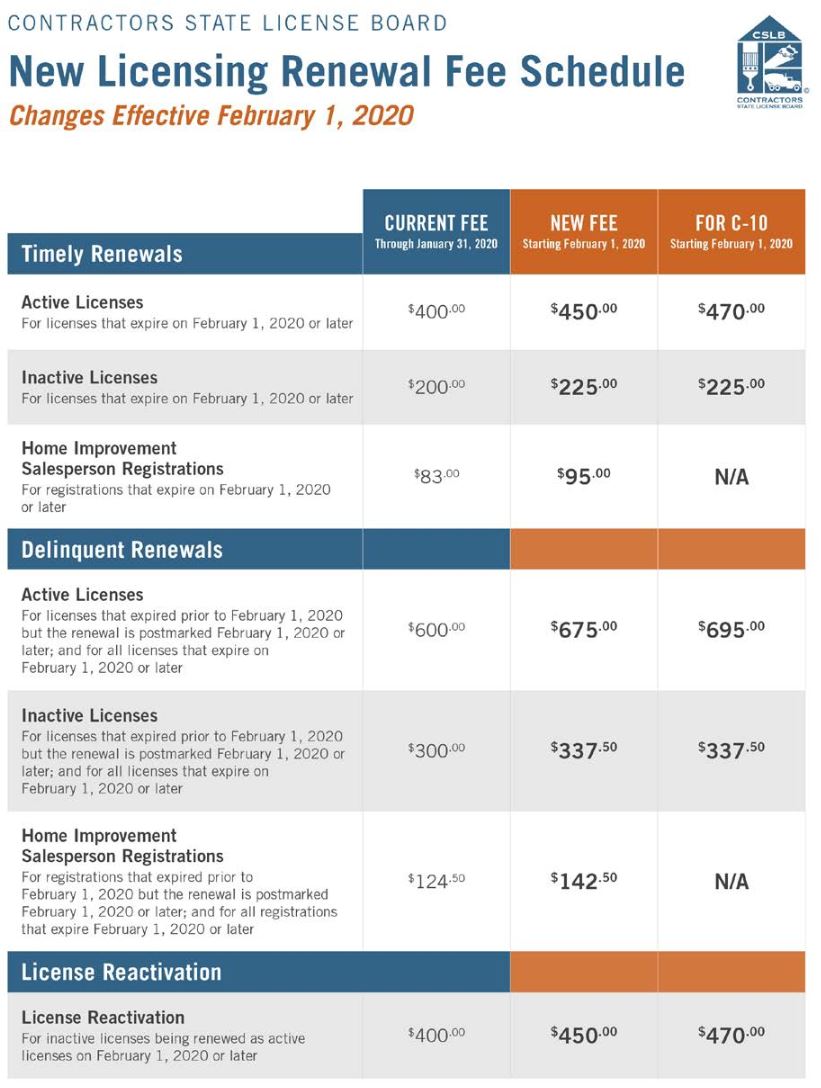 As referenced in our blog post from December 6th, the CSLB will be rolling out license fee changes, effective February 1st, as an emergency measure to raise necessary operating funds. Contractors with renewal dates after February 1st, 2020, will see their license renewal fees reflect the increased license fees. For a full breakdown of the license fee changes, please see the below diagram from the CSLB.